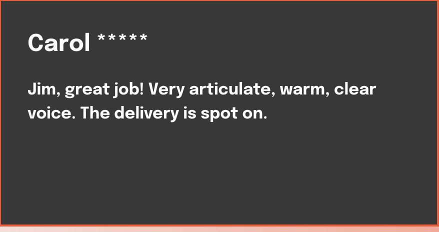 “Jim, great job! Very articlate, warm, clear voice. The delivery is spot on.”